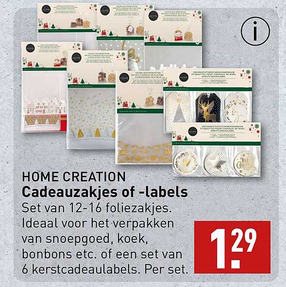 Bekijk de Home Creation Cadeauzakjes Of -Labels aanbieding bij ALDI! Deze fantastische aanbieding is nu beschikbaar in de nieuwste ALDI folder. Profiteer van deze kans en bespaar flink op je aankoop.