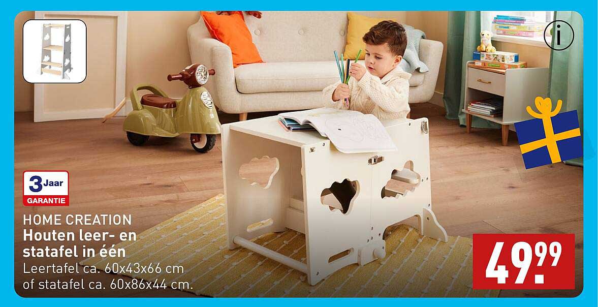 Bekijk de Home Creation Houten Leer- En Statafel In Één aanbieding bij ALDI! Deze fantastische aanbieding is nu beschikbaar in de nieuwste ALDI folder. Profiteer van deze kans en bespaar flink op je aankoop.