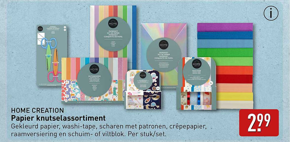 Bekijk nu de HOME CREATION Papier knutselassortiment aanbieding in de ALDI folder. Deze aanbieding is geldig van 07-04-2025 tot en met 13-04-2025.