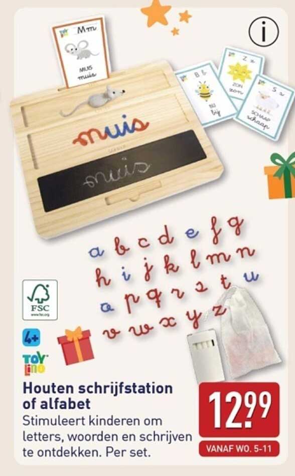 Bekijk nu de Houten schrijfstation of alfabet aanbieding in de ALDI folder. Deze aanbieding is geldig van 27-10-2025 tot en met 02-11-2025.