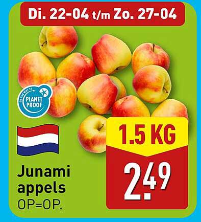 Bekijk nu de Junami appels aanbieding in de ALDI folder. Deze aanbieding is geldig van 22-04-2025 tot en met 27-04-2025.