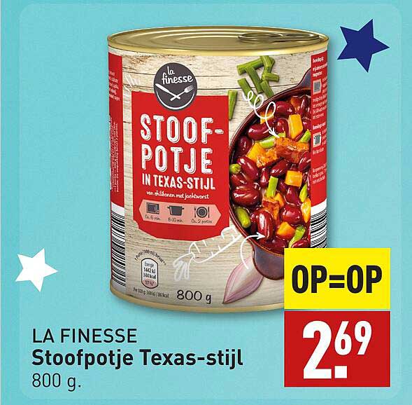 Bekijk de La Finesse Stoofpotje Texas-Stijl aanbieding bij ALDI! Deze fantastische aanbieding is nu beschikbaar in de nieuwste ALDI folder. Profiteer van deze kans en bespaar flink op je aankoop.