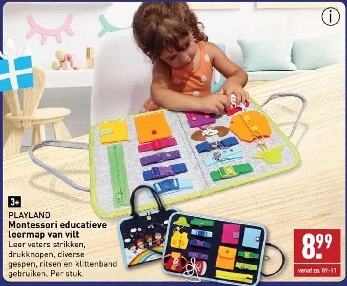 Bekijk nu de Montessori educatieve leermap van vilt aanbieding in de ALDI folder. Deze aanbieding is geldig van 24-11-2024 tot en met 01-12-2024.