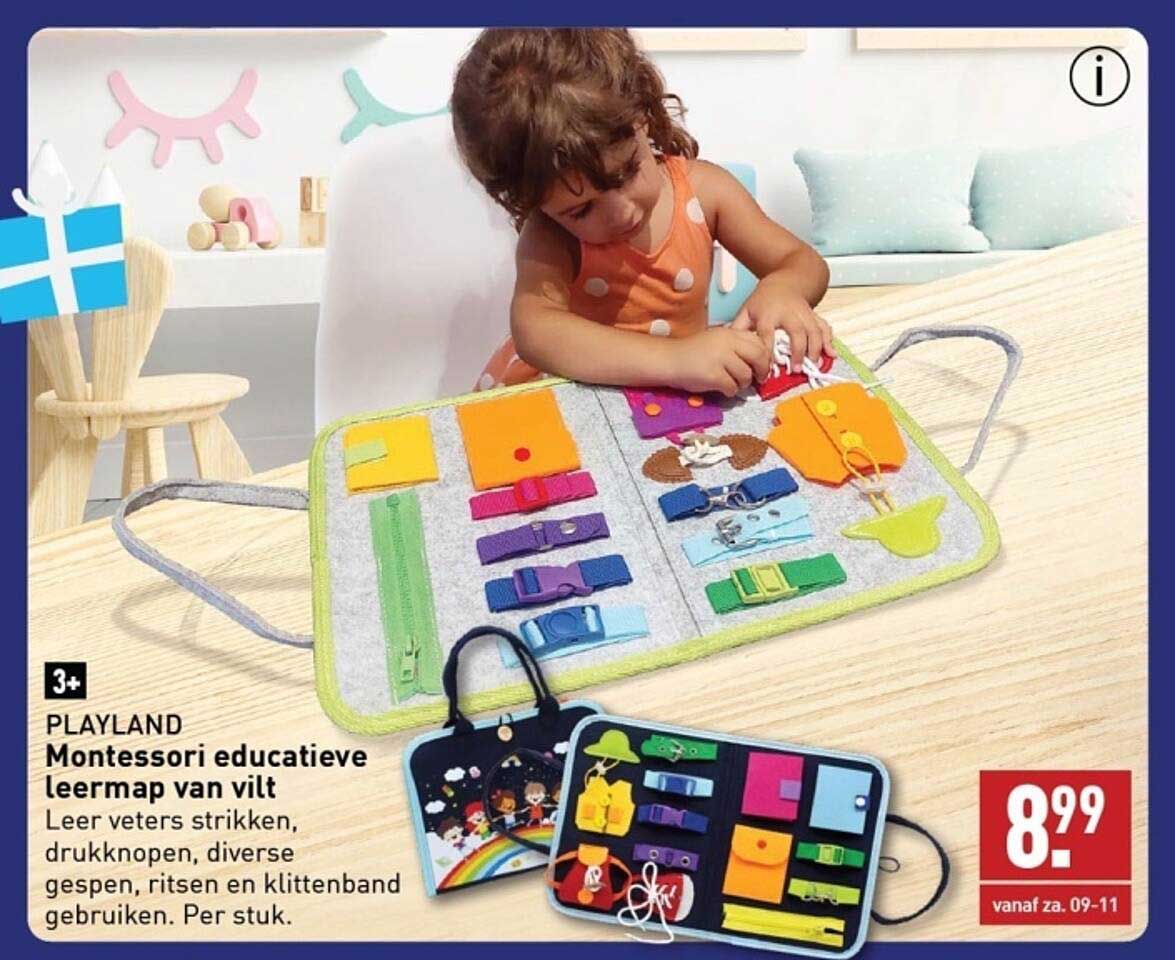 Bekijk nu de Montessori educatieve leermap van vilt aanbieding in de ALDI folder. Deze aanbieding is geldig van 01-12-2024 tot en met 09-12-2024.