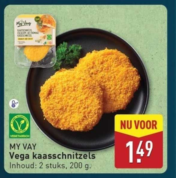 Bekijk nu de MY VAY Vega kaasschnitzels aanbieding in de ALDI folder. Deze aanbieding is geldig van 20-10-2025 tot en met 26-10-2025.