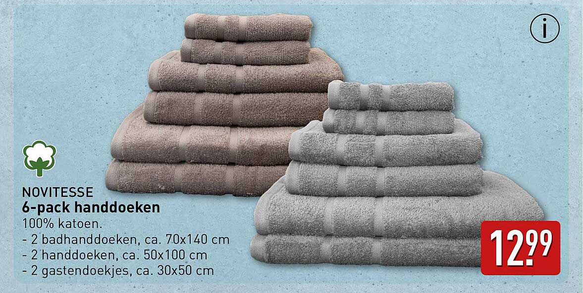 Bekijk de Novitesse 6-Pack Handdoeken aanbieding bij ALDI! Deze fantastische aanbieding is nu beschikbaar in de nieuwste ALDI folder. Profiteer van deze kans en bespaar flink op je aankoop.