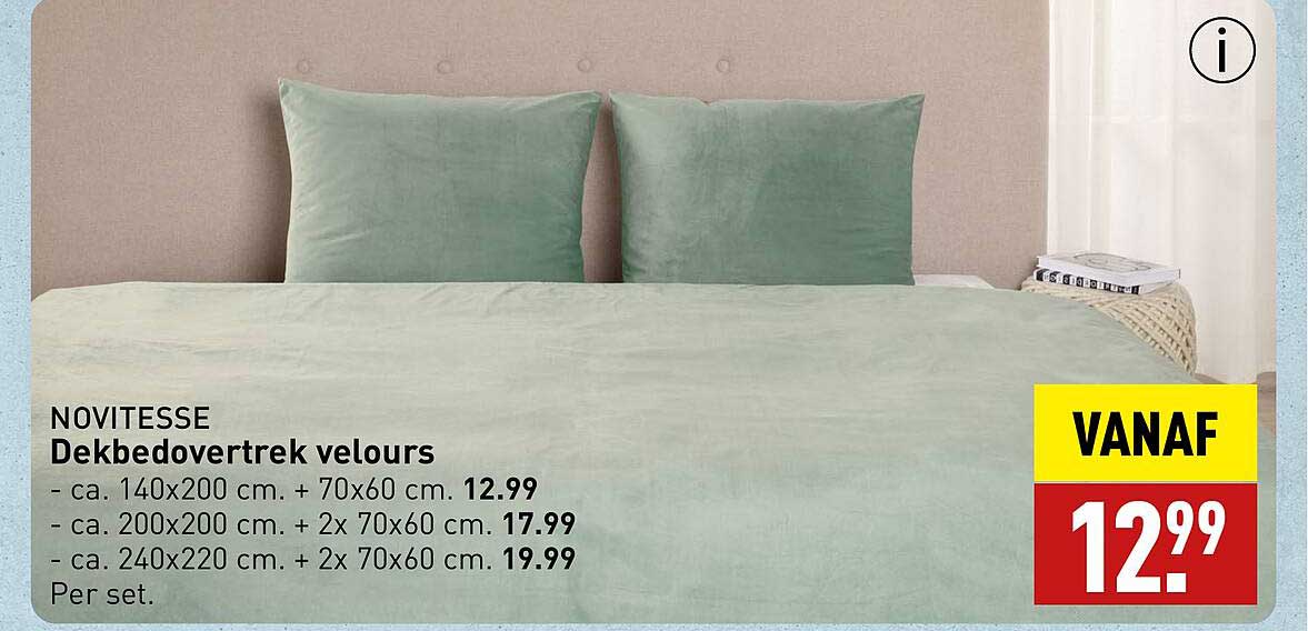 Bekijk de Novitesse Dekbedovertrek Velours aanbieding bij ALDI! Deze fantastische aanbieding is nu beschikbaar in de nieuwste ALDI folder. Profiteer van deze kans en bespaar flink op je aankoop.