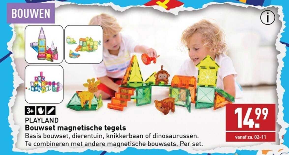 Bekijk de Playland Bouwset Magnetische Tegels aanbieding bij ALDI! Deze fantastische aanbieding is nu beschikbaar in de nieuwste ALDI folder. Profiteer van deze kans en bespaar flink op je aankoop.