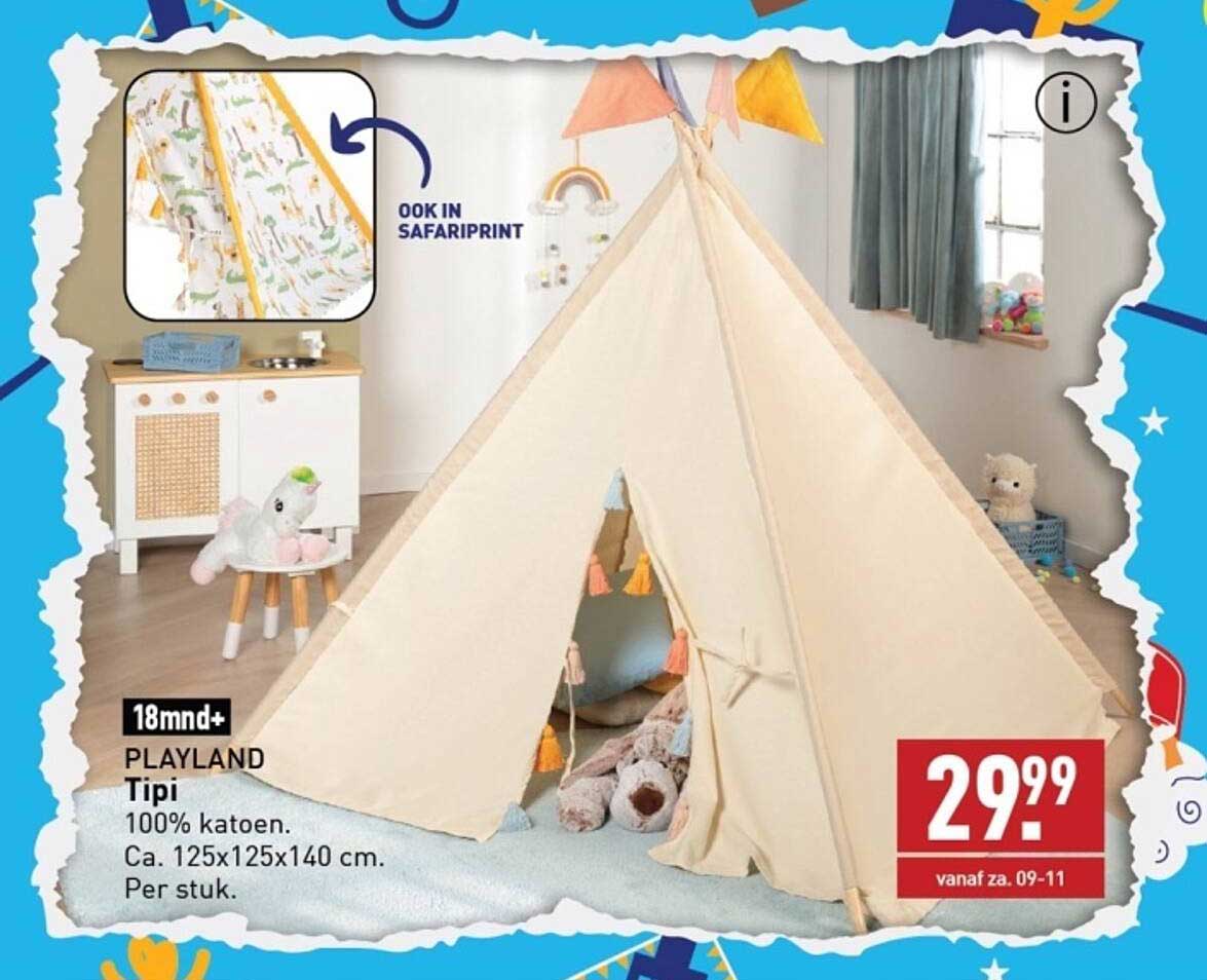 Bekijk nu de PLAYLAND Tipi aanbieding in de ALDI folder. Deze aanbieding is geldig van 11-11-2024 tot en met 17-11-2024.