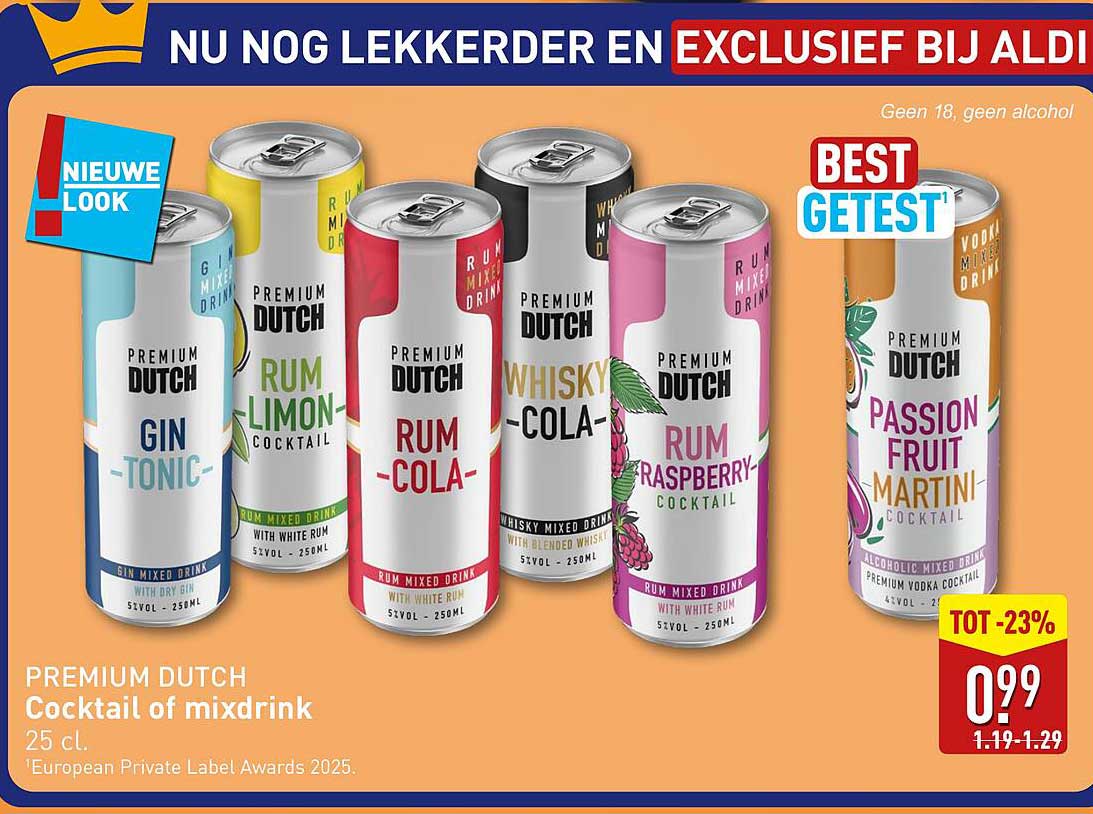 De PREMIUM DUTCH cocktails worden nu aangeboden voor slechts €0,99 per stuk, wat maar liefst 23% korting betekent vergeleken met de gebruikelijke prijs van €1,19 - €1,29! Dit is een uitstekende kans om je voorraad aan te vullen met deze heerlijke mixdranken zonder je budget te overschrijden. Mis deze kans niet om te genieten van een premium drankje tegen een prijs die je niet kunt weerstaan!