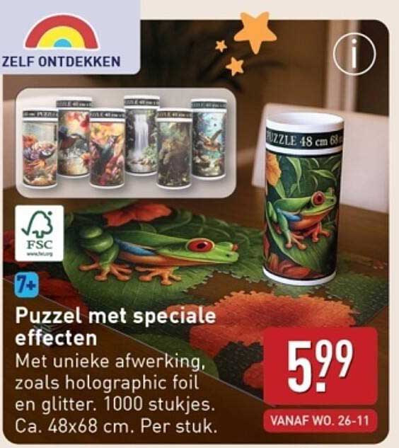 Bekijk nu de Puzzel met speciale effecten aanbieding in de ALDI folder. Deze aanbieding is geldig van 24-11-2025 tot en met 30-11-2025.