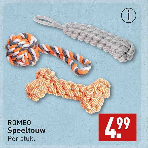 Ontdek de geweldige Romeo Speeltouw aanbieding in de nieuwste ALDI folder. Naast deze aanbieding vind je nog veel meer aantrekkelijke kortingen. Je kunt de Romeo Speeltouw eenvoudig online bestellen via de ALDI website of kopen in een winkel bij jou in de buurt.