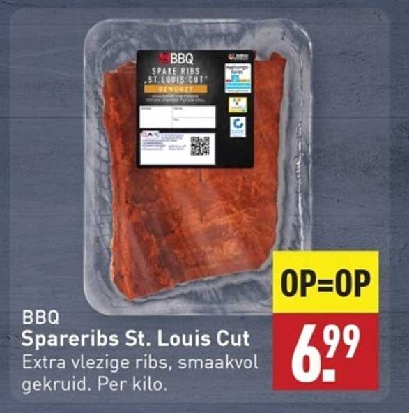 Bekijk de Spareribs St. Louis Cut aanbieding bij ALDI! Deze fantastische aanbieding is nu beschikbaar in de nieuwste ALDI folder. Profiteer van deze kans en bespaar flink op je aankoop.