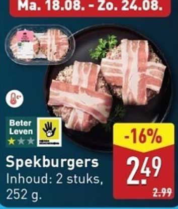 Bekijk nu de Spekburgers aanbieding in de ALDI folder. Deze aanbieding is geldig van 18-08-2025 tot en met 24-08-2025.