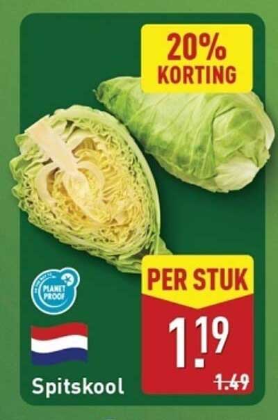 De reguliere prijs van spitskool is €1,49, maar met deze aanbieding krijg je het voor slechts €1,19! Dat is een korting van 20%! Dit maakt het de ideale gelegenheid om deze gezonde groente in huis te halen en je gerechten een boost te geven zonder je budget te overschrijden.