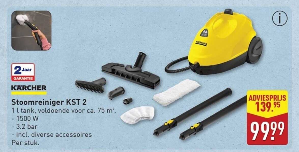 Ben je op zoek naar een krachtige en veelzijdige reinigingsoplossing? Kijk dan niet verder! De stoomreiniger KST 2 van Kärcher is nu verkrijgbaar voor een aantrekkelijke prijs. Deze aanbieding is perfect voor iedereen die zijn huis wil laten stralen zonder chemische middelen te gebruiken. Met een krachtige stoomdruk van 3,2 bar en een tankinhoud die genoeg is voor ongeveer 75 m², ben je verzekerd van een grondige reiniging.
