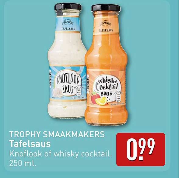 Ben je op zoek naar een manier om je maaltijden een extra smaakboost te geven? Dan is deze aanbieding van de TROPHY SMAAKMAKERS tafelsaus perfect voor jou! Verkrijgbaar in twee heerlijke varianten: knoflooksaus en whisky cocktail saus. Ideaal voor bij barbecuegerechten, burgers of gewoon om je gerechten mee op te fleuren. Deze sausjes zijn niet alleen veelzijdig, maar ook super betaalbaar!