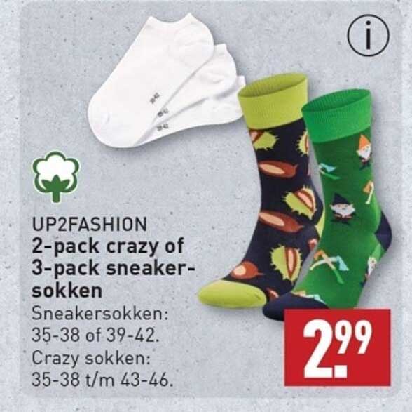 Bekijk de Up2Fashion 2-Pack Crazy Of 3-Pack Sneaker-Sokken aanbieding bij ALDI! Deze fantastische aanbieding is nu beschikbaar in de nieuwste ALDI folder. Profiteer van deze kans en bespaar flink op je aankoop.