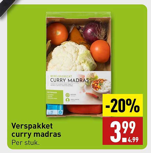 Bekijk de Verspakket Curry Madras aanbieding bij ALDI! Deze fantastische aanbieding is nu beschikbaar in de nieuwste ALDI folder. Profiteer van deze kans en bespaar flink op je aankoop.