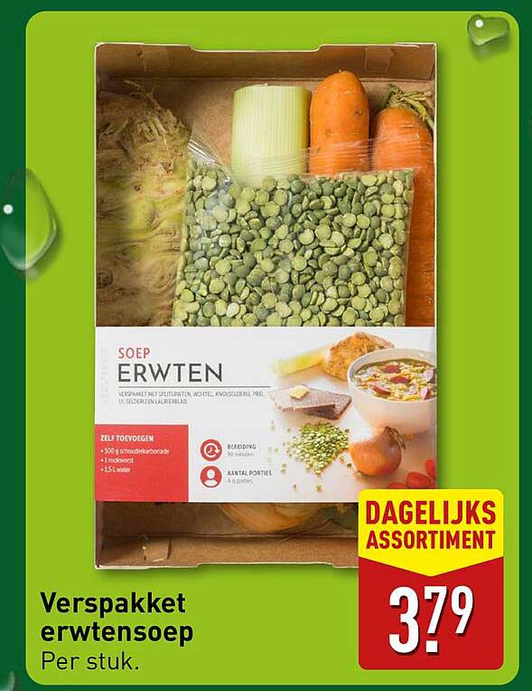 Ontdek de geweldige Verspakket Erwtensoep aanbieding in de nieuwste ALDI folder. Naast deze aanbieding vind je nog veel meer aantrekkelijke kortingen. Je kunt de Verspakket Erwtensoep eenvoudig online bestellen via de ALDI website of kopen in een winkel bij jou in de buurt.
