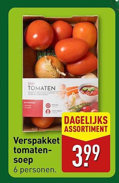 Bekijk de Verspakket Tomatensoep aanbieding bij ALDI! Deze fantastische aanbieding is nu beschikbaar in de nieuwste ALDI folder. Profiteer van deze kans en bespaar flink op je aankoop.