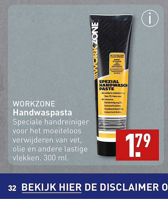Bekijk de Workzone Handwaspasta aanbieding bij ALDI! Deze fantastische aanbieding is nu beschikbaar in de nieuwste ALDI folder. Profiteer van deze kans en bespaar flink op je aankoop.