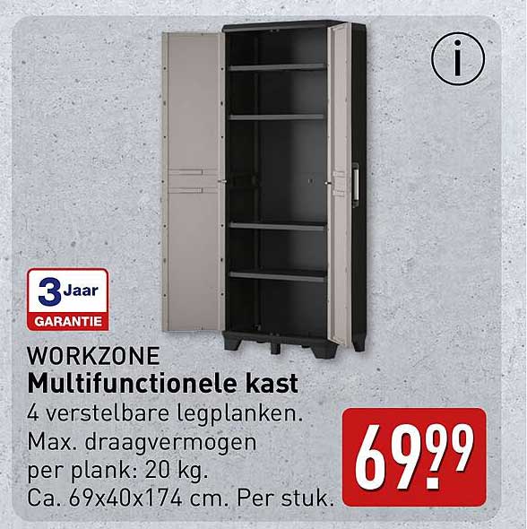 Bekijk de Workzone Multifunctionele Kast aanbieding bij ALDI! Deze fantastische aanbieding is nu beschikbaar in de nieuwste ALDI folder. Profiteer van deze kans en bespaar flink op je aankoop.