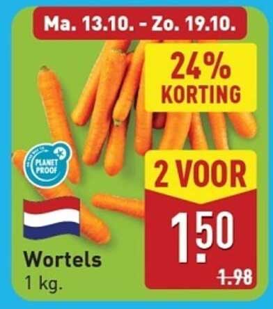 Bekijk nu de Wortels 1 kg - 2 voor 1,50 aanbieding in de ALDI folder. Deze aanbieding is geldig van 13-10-2025 tot en met 19-10-2025.