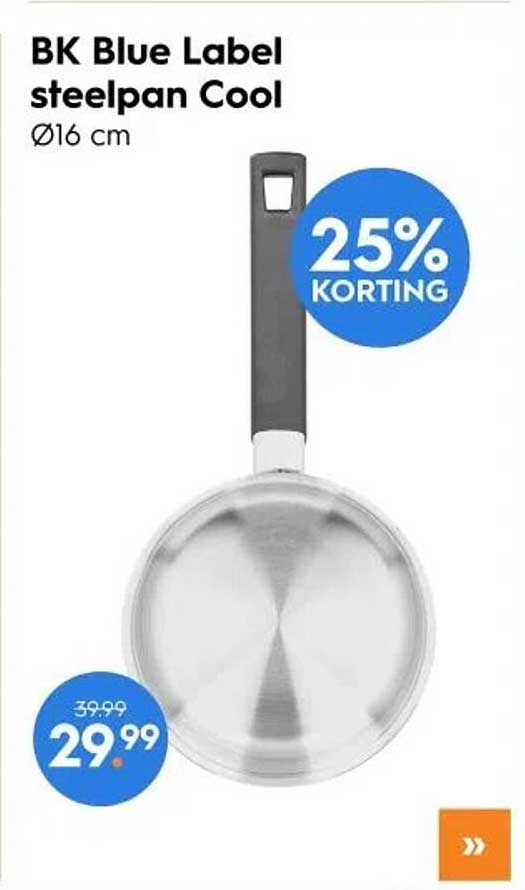 Bekijk de Bk Blue Label Steelpan Cool aanbieding bij Blokker! Deze fantastische aanbieding is nu beschikbaar in de nieuwste Blokker folder. Profiteer van deze kans en bespaar flink op je aankoop.