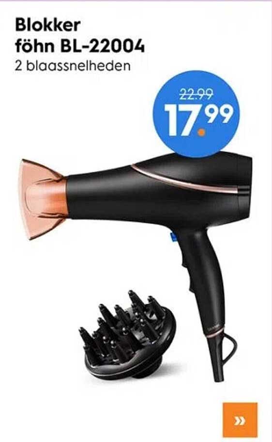 Bekijk de Blokker Föhn Bl-22004 aanbieding bij Blokker! Deze fantastische aanbieding is nu beschikbaar in de nieuwste Blokker folder. Profiteer van deze kans en bespaar flink op je aankoop.