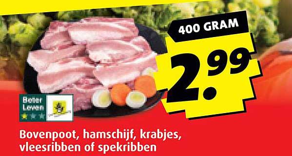 Ben je op zoek naar een heerlijke toevoeging aan je maaltijden zonder je portefeuille te veel te belasten? Kijk dan hier! Deze aanbieding, geldig van 2025-10-06 tot en met 2025-10-12, biedt je de kans om te genieten van een gevarieerd aanbod aan vleesproducten, waaronder bovenpoot, hamschijf, krabjes, vleessribben of spekribben, allemaal voor een fantastische prijs van slechts €2,99 per 400 gram.
