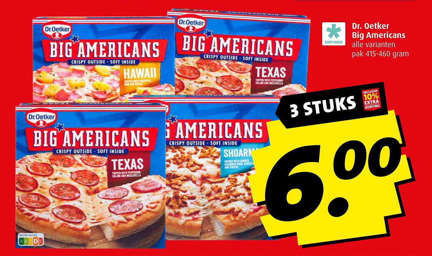 Bekijk nu de Dr. Oetker Big Americans 3 stuks voor €6,00 aanbieding in de Boni folder. Deze aanbieding is geldig van 31-03-2025 tot en met 06-04-2025.
