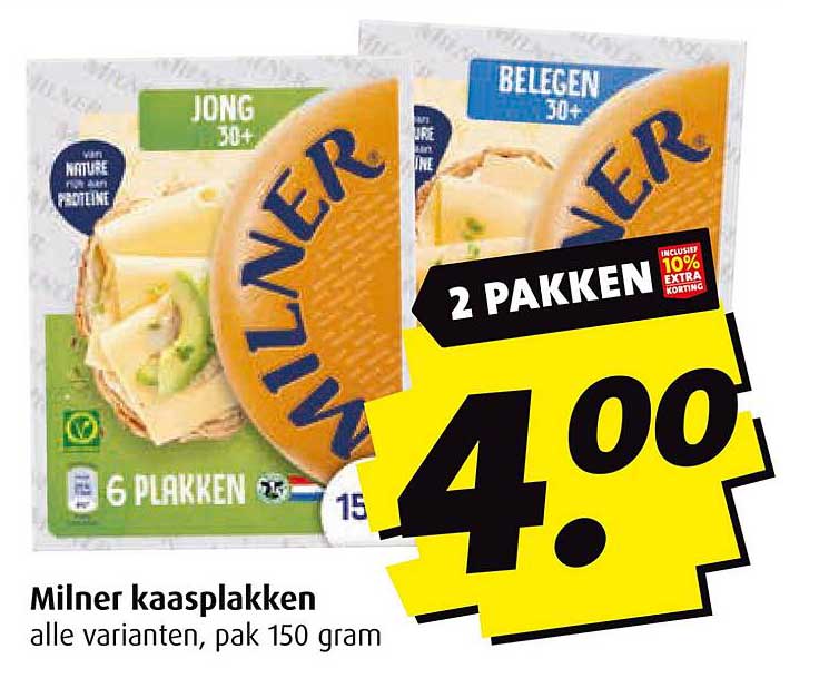 Normaal betaal je vaak meer dan €4,00 voor één pakje Milner kaas. Deze aanbieding is dan ook een uitgelezen kans om te profiteren van een scherpe prijs, waarmee je dubbele hoeveelheden kunt inslaan voor een lagere prijs. Geen twijfels meer, en dat naast de extra 10% korting die je bij deze aanbieding ontvangt!