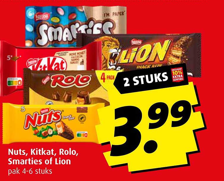 Bekijk nu de Nuts, Kitkat, Rolo, Smarties of Lion, pak 4-6 stuks aanbieding in de Boni folder. Deze aanbieding is geldig van 31-03-2025 tot en met 06-04-2025.