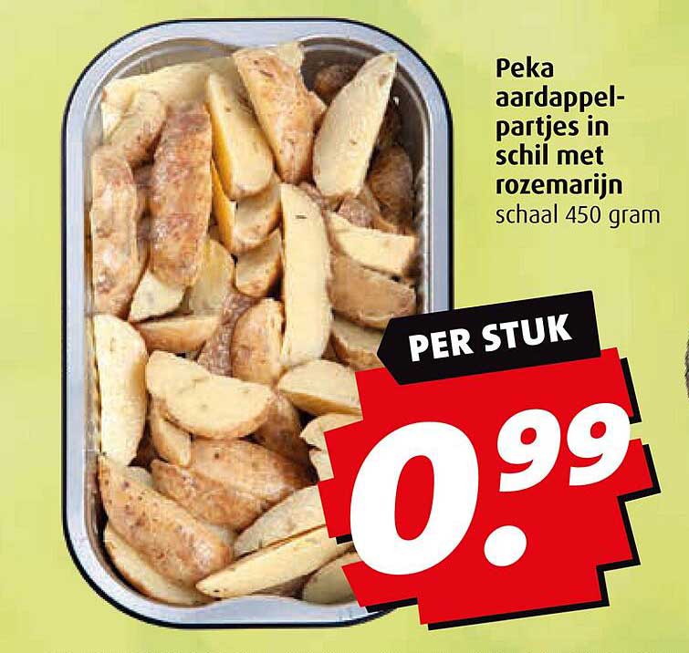 Bekijk nu de Peka aardappelpartjes in schil met rozemarijn schaal 450 gram aanbieding in de Boni folder. Deze aanbieding is geldig van 07-04-2025 tot en met 13-04-2025.