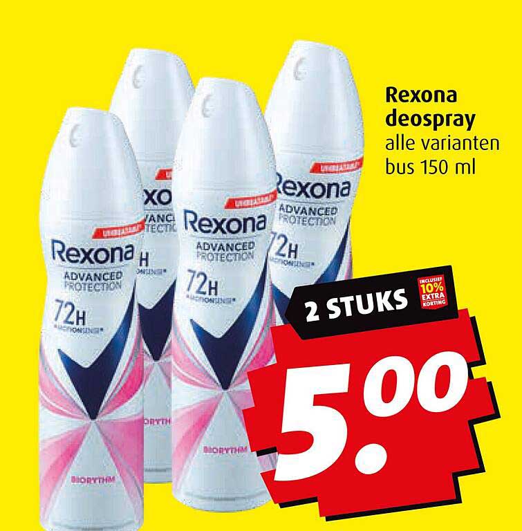 Bekijk nu de Rexona deospray alle varianten bus 150 ml aanbieding in de Boni folder. Deze aanbieding is geldig van 21-04-2025 tot en met 27-04-2025.