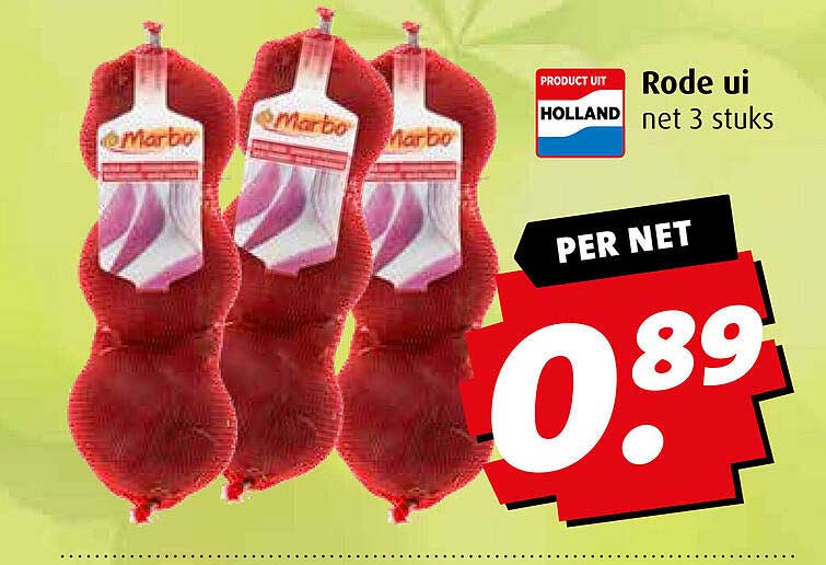 Bekijk de Rode Ui Net 3 Stuks aanbieding bij Boni! Deze fantastische aanbieding is nu beschikbaar in de nieuwste Boni folder. Profiteer van deze kans en bespaar flink op je aankoop.