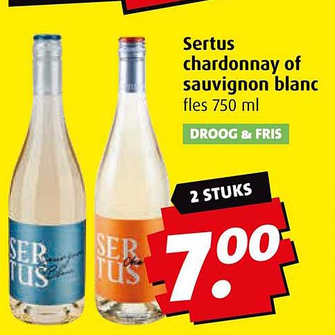 Bekijk nu de Sertus chardonnay of sauvignon blanc fles 750 ml aanbieding in de Boni folder. Deze aanbieding is geldig van 24-03-2025 tot en met 30-03-2025.