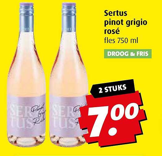 Ontdek de geweldige Sertus Pinot Grigio Rosé aanbieding in de nieuwste Boni folder. Naast deze aanbieding vind je nog veel meer aantrekkelijke kortingen. Je kunt de Sertus Pinot Grigio Rosé eenvoudig online bestellen via de Boni website of kopen in een winkel bij jou in de buurt.