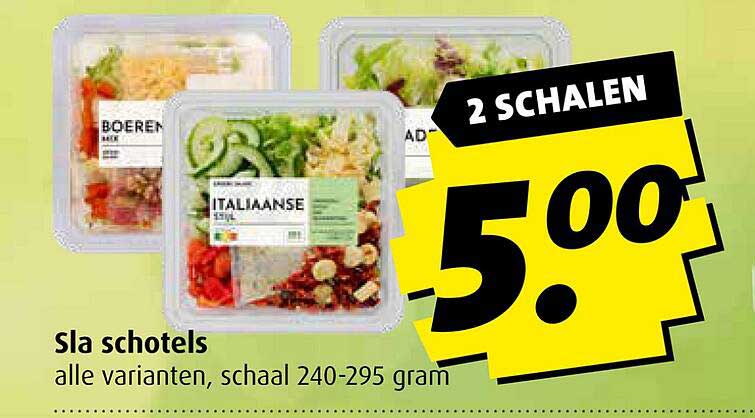 Bekijk nu de Sla schotels aanbieding in de Boni folder. Deze aanbieding is geldig van 09-06-2025 tot en met 14-06-2025.