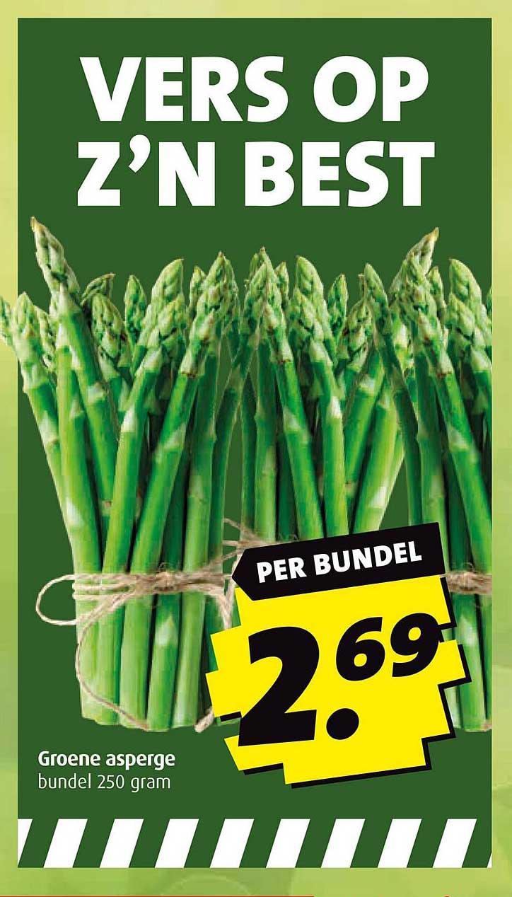 Maak je klaar voor een culinaire traktatie! Op deze pagina vind je de aanbieding voor de heerlijke groene asperges van Boni. Deze verse asperges zijn niet alleen een smaakvolle toevoeging aan je maaltijden, maar ook ultiem gezond. Met een speciale prijs van €2,69 voor een bundel van 250 gram, is dit het perfecte moment om je voorraad aan te vullen!