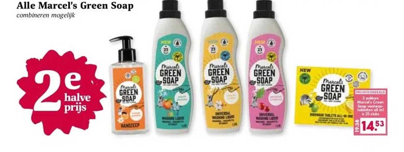 Ontdek de onweerstaanbare aanbieding van Marcel's Green Soap! Van 14 april tot en met 19 april 2025 kun je genieten van de tweede helft van de prijs op alle producten van dit eco-vriendelijke merk. Marcel's Green Soap staat bekend om zijn natuurlijke en krachtige formules die perfect zijn voor het schoonmaken van jouw huis zonder schadelijke chemicaliën. Dit is dé kans om jouw huishouden op een verantwoorde manier te reinigen!