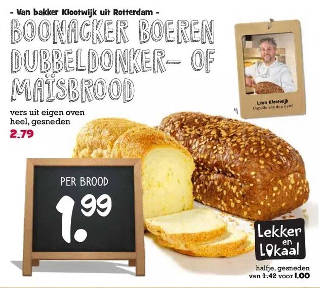 Op zoek naar een smakelijk brood dat vers uit de oven komt? Dan is deze aanbieding echt iets voor jou! Het Boonacker boeren dubbeldonker- of maïsbread, gebakken door de gerenommeerde bakker Klootwijk uit Rotterdam, biedt jou de perfecte combinatie van smaak en kwaliteit. Met een introductieprijs van slechts €1,99 per brood is dit een aanbieding die je niet wilt missen!