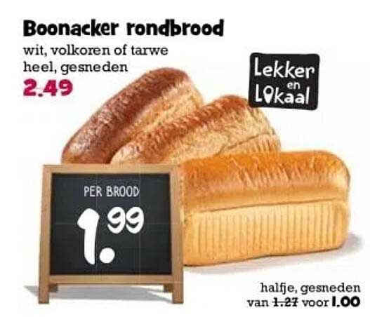 Bekijk de Boonacker Rondbrood aanbieding bij Boon's Markt! Deze fantastische aanbieding is nu beschikbaar in de nieuwste Boon's Markt folder. Profiteer van deze kans en bespaar flink op je aankoop.