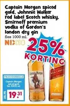 Bekijk nu de Captain Morgan spiced gold, Johnnie Walker red label Scotch whisky, Smirnoff premium vodka of Gordon's london dry gin fles 1000 ml. aanbieding in de Boon's Markt folder. Deze aanbieding is geldig van 20-04-2025 tot en met 27-04-2025.