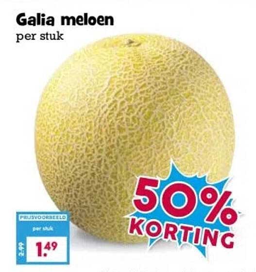 De normale prijs voor een Galia meloen bedraagt €2,99, maar met deze aanbieding kun je hem nu voor slechts €1,49 kopen. Dit betekent een besparing van 50%! Een geweldige deal voor een product dat niet alleen lekker is, maar ook gezond.