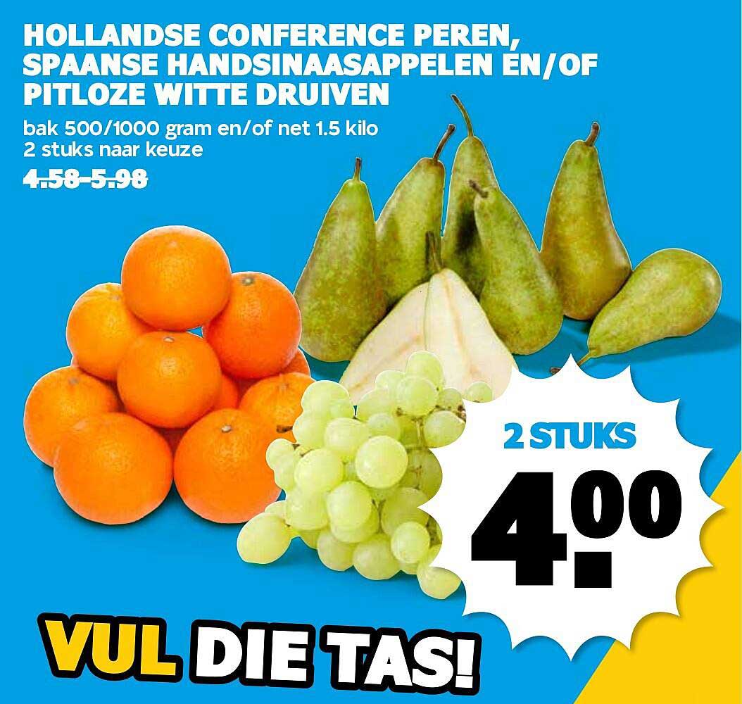 Wil je direct op de hoogte zijn zodra de Hollandse Conference Peren, Spaanse Handsinaasappelen En/Of Pitloze Witte Druiven in de aanbieding is? Meld je aan voor onze aanbiedingen-alert. Zo krijg je een melding zodra het product tegen een voordelige prijs beschikbaar is.