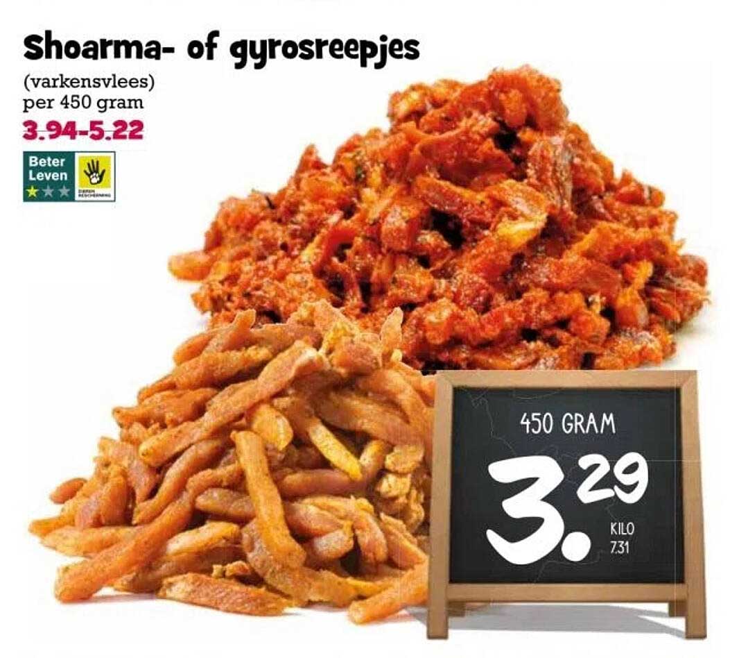 De shoarma- en gyrosreepjes zijn perfect voor allerlei gerechten. Of je ze nu in een pita met frisse groenten of op een bedje van rijst serveert, ze zijn altijd een hit! Deze smaakvolle vleesreepjes zijn ook geweldig voor een informele borrel, bijvoorbeeld in wraps of als onderdeel van een tapasplank. Met het Beter Leven-keurmerk kun je bovendien kiezen met een goed gevoel, wetende dat het vlees een betere kwaliteit heeft.