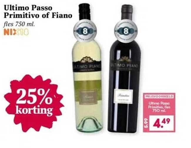 Ontdek de heerlijke smaken van Ultimo Passo Primitivo of Fiano, nu met een korting van maar liefst 25%! Deze wijnen zijn perfect voor een gezellig diner of een ontspannen avond thuis. Of je nu een liefhebber bent van de rijke, volle smaken van Primitivo of de frisse, fruitige tonen van Fiano, er is voor ieder wat wils. Deze aanbieding is geldig van 14 tot en met 19 april 2025, dus wees er snel bij!