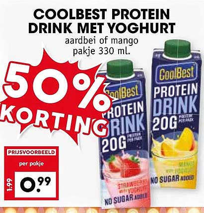 Ben je op zoek naar een verfrissende en gezonde drank die je helpt je eiwitten aan te vullen? Dan is deze aanbieding van de CoolBest Protein Drink met Yoghurt echt iets voor jou! Met een smaakvolle mix van aarbei of mango, is dit een heerlijke traktatie die perfect is na een workout of als tussendoortje. En met 50% korting deze week, hoef je niet lang na te denken!